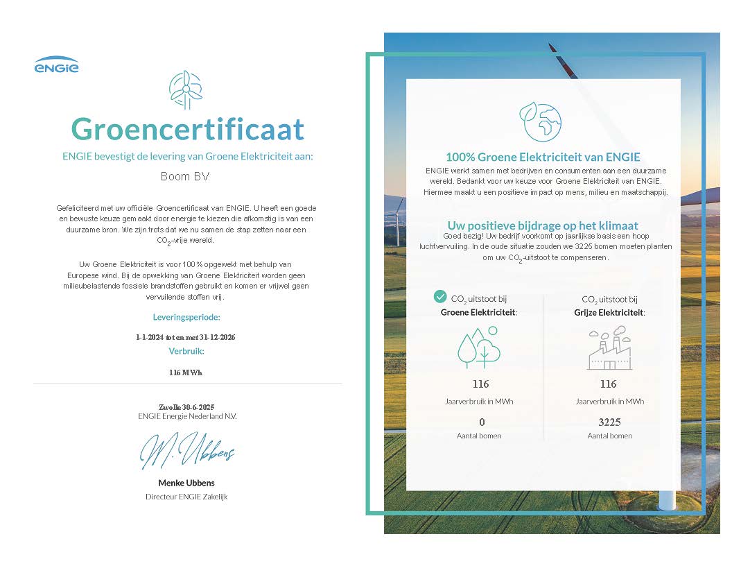 Bij Boom werken we elke dag aan een duurzamere toekomst. Met 772 zonnepanelen wekken we een groot deel van onze eigen energie op. Is het bewolkt? Dan gebruiken we 100% groene stroom uit Nederlandse wind, officieel gecertificeerd. Deze keuze wordt ondersteund met een officieel groencertificaat, waarmee wordt gegarandeerd dat onze elektriciteit afkomstig is uit hernieuwbare bronnen