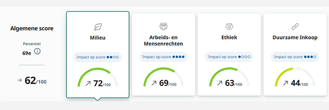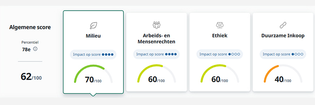 In de beoordeling zien we duidelijke vooruitgang. Onze inspanningen op het gebied van milieu, arbeidsomstandigheden, ethiek en duurzame inkoop werpen hun vruchten af. Hoewel onze totaalscore gelijk is gebleven, laten de verbeterde deelresultaten zien dat we structureel stappen vooruitzetten. De herbevestiging van de bronzen medaille is dan ook een mooie blijk van waardering voor het werk dat we met z’n allen verzetten.