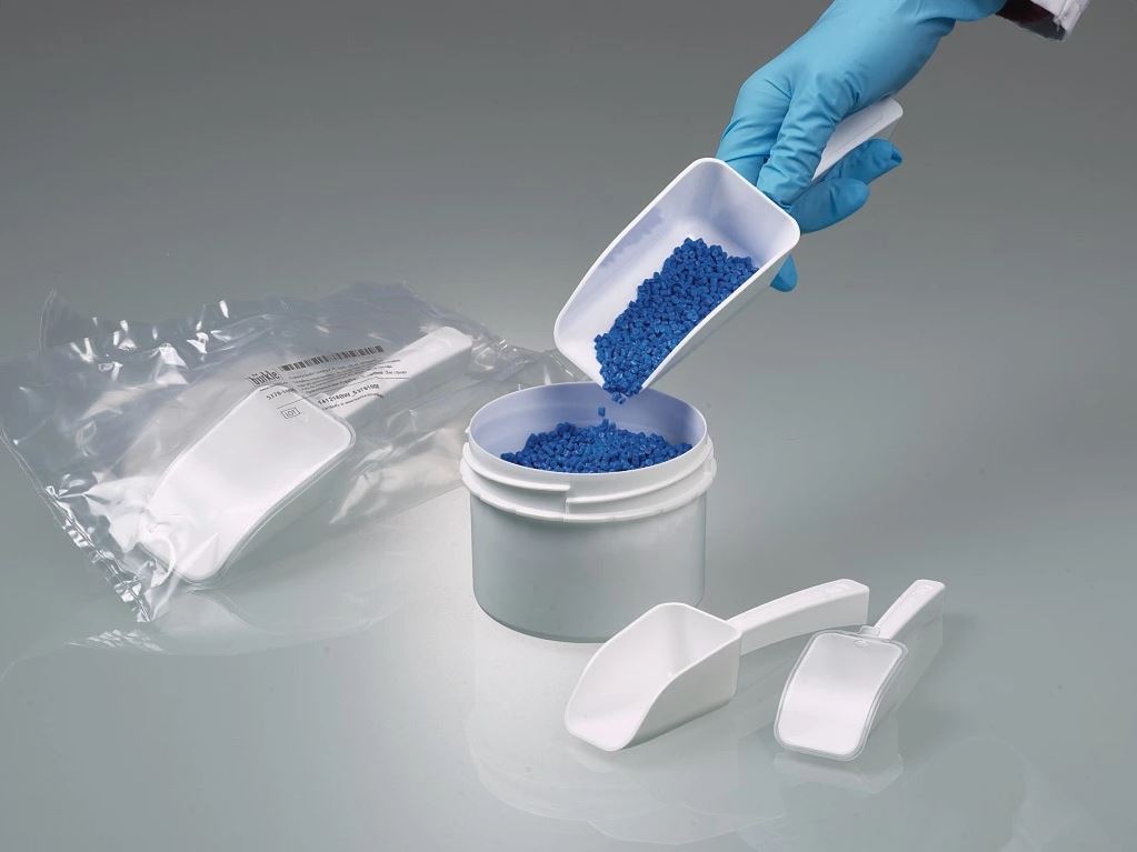 De detecteerbare SteriPlast® lepels van Bürkle, gemaakt van blauwe polystyreen, geproduceerd (met uitzondering van de scoop 1000 ml) en geassembleerd in onze klasse 7 cleanroom (10.000), zijn afzonderlijk verpakt voor eenmalig gebruik en daarna gesteriliseerd met gammastralen.