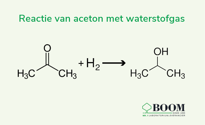 Een andere methode om isopropanol te synthetiseren is door de reactie van aceton met waterstofgas, hiernaast staat een afbeelding die deze reactie illustreerd.