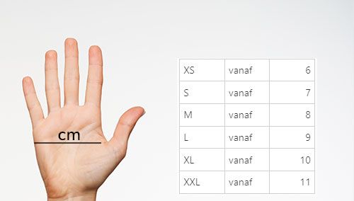 Een te grote of te dikke handschoen vergroot de kans op ongelukken. Zorg er dus voor dat de handschoenen goed zitten. Meet uw handpalm van links naar rechts en vind de juiste maat in de tabel. Het aantal cm dat u meet, geeft uw maat weer.
