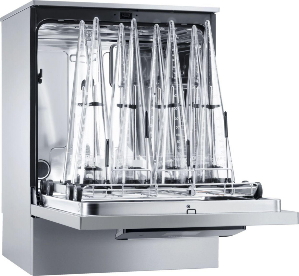 Laboratoriumvaatwasser met dosering van vloeibaar reinigingsmiddel en DryPlus-heteluchtdrogingCapaciteit en beladingReinigt tot 128 laboratoriumflessenFlexibel en gebruiksvriendelijk dankzij het modulaire beladingssysteem en het EasyLoad-systeem.Bedieningsgemak en connectiviteitMaximale controle via het Full-Touch kleurendisplay – M Touch FlexAf fabriek voorbereid op aansluiting via wifi of Ethernet.Intelligente gebruikersassistentieEen machine die zichzelf verklaartDankzij duidelijke instructies verlopen processen soepel en worden stilstandtijden tot een minimum beperkt.Droogtechnologie: DryPlusVoor perfecte droogresultatenEfficiënte heteluchtdroging, ideaal voor smal laboratoriumglaswerk en holle instrumenten.Veiligheid door controleSpoeldrukbewaking: continu toezicht voor consistente reinigingsresultatenSproeiarmbewaking: betrouwbare werking dankzij toerentalbewaking van de sproeiarmenKamerverlichtingTwee krachtige LED’s in het bovenste deel van de kamer zorgen voor optimale zichtbaarheid tijdens het beladen en leeghalen.Glazen deurTransparantie voor professionalsDe glazen deur maakt visuele controle van het spoelproces eenvoudig en doeltreffend.Hygiëne en reinigingNaadloos gelaste spoelruimte – ontworpen voor optimale hygiëne en eenvoudige reiniging.Geïntegreerde waterontharderZorgt voor kalkvrij spoelwater en een uitstekend reinigingseffect, elke cyclus opnieuw.
