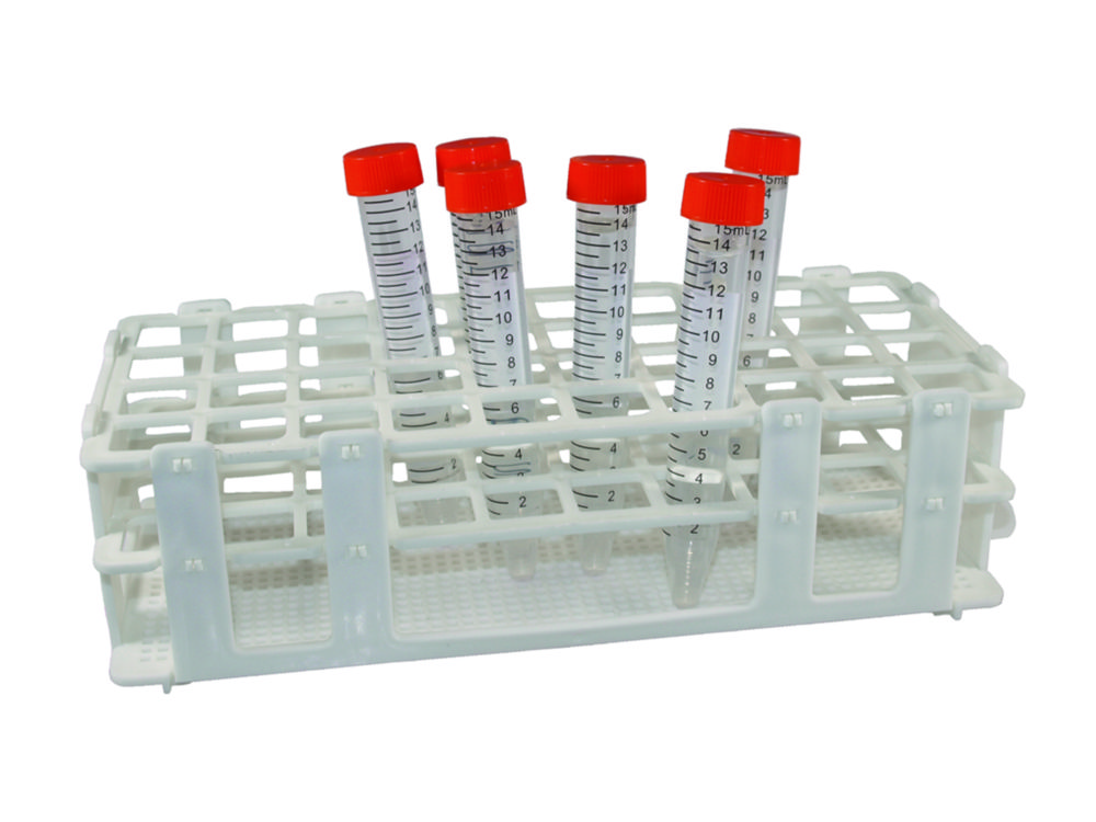 PP, met hoge dichtheid, waardoor ze niet gaan drijven in een waterbad. De rekken worden uitgevouwen geleverd en zijn eenvoudig in elkaar te zetten. Genummerde plaatsen. Autoclaveerbaar.