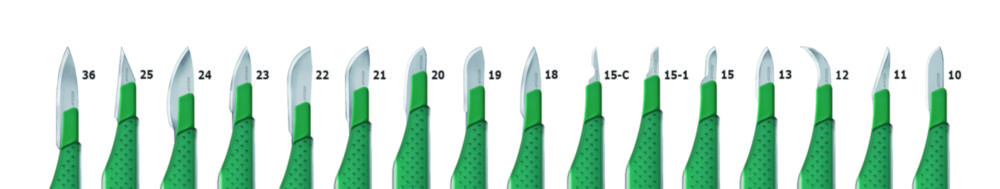 Voor scalpelhandvatten. Niet-steriel. Bayha-vergrendelsysteem. Scalpelmesjes in steriele uitvoering op aanvraag leverbaar, m.u.v. modellen S01 en 18R.